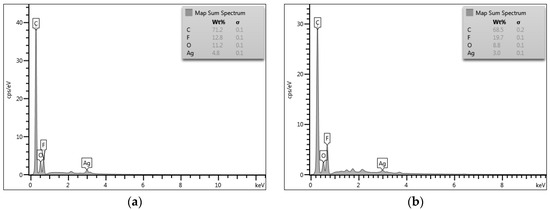 Energy dispersive X-ray (EDX) data of (a) Ag/PVDF-HFP and (b) Ag-MWCNTs/PVDF-HFP.