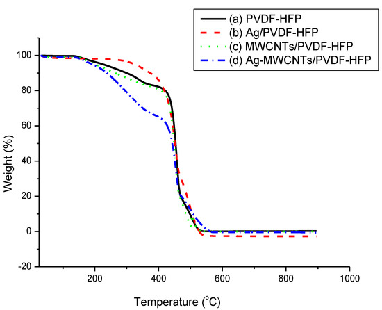 Thermogravimetric analysis (TGA) of (a) PVDF-HFP, (b) Ag/PVDF-HFP, (c) MWCNTs/PVDF-HFP (d) Ag-MWCNTs/PVDF-HFP.