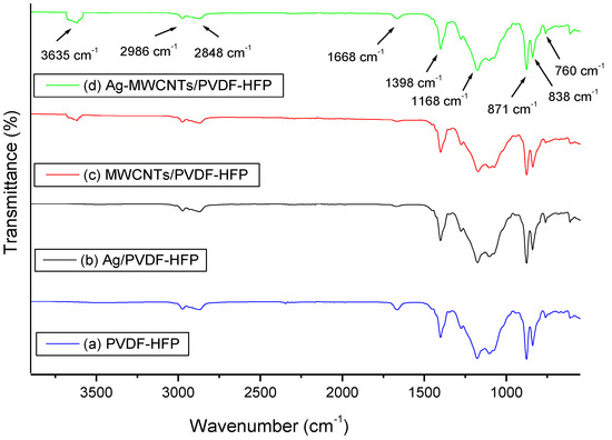 Fourier transform infrared (FTIR) spectra of (a) PVDF-HFP, (b) Ag/PVDF-HFP, (c) MWCNTs/PVDF-HFP, and (d) Ag-MWCNTs/PVDF-HFP.