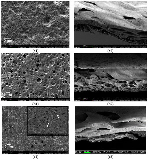 Figure 5 shows SEM images of PVDF-HFP, Ag/PVDF-HFP, MWCNTs/PVDF-HFP and Ag-MWCNTs/PVDF-HFP membranes. The addition of Ag nanoparticles changed the spongy surface layer of PVDF-HFP (Figure 5(a1)) into a highly porous structure (Figure 5(b1)). The cross-section clearly depicts a disappearance of a dense layer of PVDF-HFP upon Ag loading (Figure 5(b2)). This data is consistent with the improved permeability of the Ag/PVDF-HFP composite membrane (Table 1), and studies elsewhere on Ag/PVDF membranes [21]. The SEM image in Figure 5(c1), insert, depicts the surface of PVDF-HFP entangled with well dispersed MWCNTs. These MWCNTs can be easily seen on the cross-section (Figure 5(c2)), stretching from the surface to the bottom layer of PVDF-HFP.