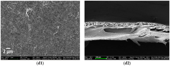 The enhanced porosity can be attributed to several openings available on MWCNTs; hence, the MWCNTs/PVDF-HFP composite membrane was found to be highly porous compared to all membranes (Table 1). However, the combined effects of Ag nanoparticles and MWCNTs do not improve the porosity of PVDF-HFP, as evidenced by the formation of a dense surface layer (Figure 5(d1)). Although the cross-section of the MWCNTs/PVDF-HFP (Figure 5(c2)) and Ag-MWCNTs/PVDF-HFP (Figure 5(d2)) membrane are related, the latter had openings and the surface of MWCNTs was blocked by Ag nanoparticles.