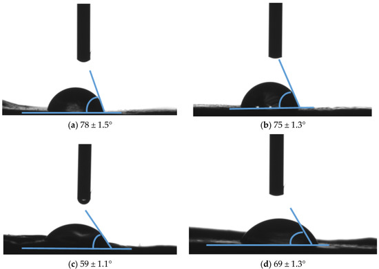 Contact angle measurements of (a) PVDF-HFP; (b) Ag/PVDF-HFP, (c) MWCNTs/PVDF-HFP and (d) Ag-MWCNTs/PVDF-HFP.