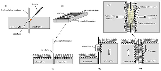 It is widely acknowledged that the functionality of any artificial membrane is built-in during its formation, i.e., the thermodynamics that hold it in place also govern the way it interacts with its surrounding. Self-assembly is the simplest way to produce a membrane as long as a suitable drive is provided. Spreading lipids (in organic solvent) across an aperture that separates two aqueous phases, forces them to organize themselves into two leaflets, orienting their hydrophilic heads in each side towards the solution in order to keep the hydrophobic tails enclosed [24,25,26,27,28] (Figure 2). The formation is sustained by the interplay between two forces: the hydrodynamic force that tries to compress the two leaflets in the horizontal axis and the solvent stored at the edge of the aperture (Plateau-Gibbs border) that tries to separate them at the perpendicular axis. The bilayer controls ion mobility between the two aqueous phases, i.e., the current flux (transmembrane current), while building up dipolar potential perpendicular to the membrane plane [29]. The polar region attracts ions that accumulate at the membrane surface giving rise to a surface charge. Any electrochemical change at the interface between the membrane surface and the solution (at Debye length) alters the dipolar potential, the surface charge or the packing of lipids (or any combination of the above), resulting in the formation of (temporary or permanent) pores or channels, i.e., small defects through the hydrophobic continuum, that allow the passage of ions to the other side of the membrane [13]; electrical potential, capacitance, current, and elasticity changes can be readily monitored with two- or three-electrode systems. As biochemical interactions occurring at the membrane surface produce such electrochemical changes, any affinity system (substrate-enzyme, antigen-antibody, ion channel activity, substrate-receptor, DNA, etc.) can be reconstituted within these lipid platforms to yield sensor set-ups (Figure 3).