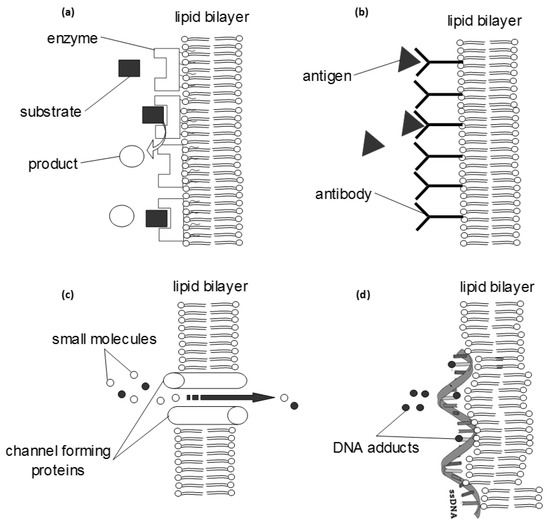 Some basic biochemical systems that can be reconstituted within an artificial lipid bilayer and further engineered into a diagnostic system (biosensor). The transduction of the biochemical information into a detector signal can be achieved with electrochemical, optical, piezoelectric or magnetic sensors. (a) bioaffinity interfaces can be constructed using enzymes or receptors, adsorbed on the membrane surface; the whole system can be optimized electrochemically (using redox amplifiers) or optically (using fluorescent tags). (b) The monitoring of immunochemical reactions follows similar methodology and further allows for the development of more advanced and rapid signal propagation systems (e.g., using enzymes, tagging or radiochemistry). (c) Many channel-forming proteins have been reconstituted within a bilayer; small molecules can flow through the channel, but in most cases some selectivity rules apply that make possible the development of a detection system (e.g., gramicidin channels transport potassium ions faster than sodium while valinomycin channels transport only potassium ions). (d) Single- or double-stranded DNA can adsorb on the membrane surface to investigate the effects of various adducts or to detect mutagens.