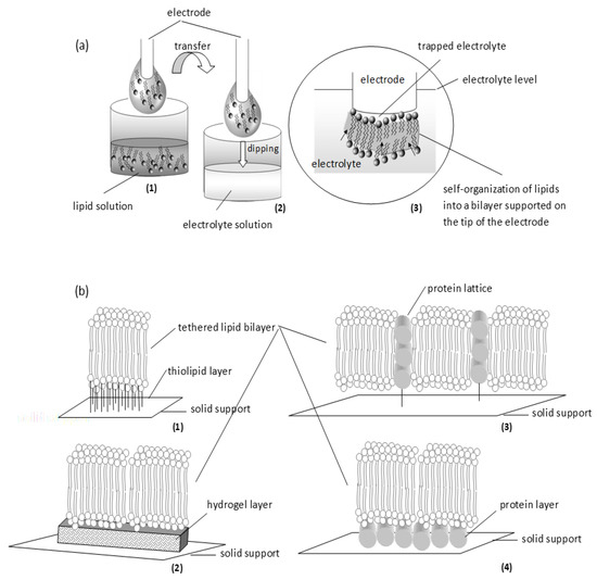 The dipping method is the simplest way to construct a bilayer platform onto the tip of a metal (Ag, Pt, Ni, etc.) wire: when the wire is dipped into the lipid solution, a small drop of the solution adheres at the wire edge; when the wire is transferred into an electrolyte solution, the lipid drop is forced to self-organize into a bilayer at the wire tip (Figure 4). This is possibly a two-step process [34]: as the wire is immersed into the electrolyte, a monolayer is attached onto the support through colloidal interactions, pushing and trapping a small amount of water between the metal and the polar area of the lipid layer; when the wire is fully immersed dispersed lipid molecules form the second monolayer on top of the first. The resulting membrane is asymmetric in terms of fluidity: the mobility of lipids at the inner leaflet (those in contact with the metal) is restricted, whereas the lipids at the outer leaflet (those in contact with the electrolyte) can move more freely [35]. Vesicle fusion is a simpler variation of this technique: charged unilamellar vesicles are injected onto an oppositely charged solid support [36]; upon contact with the metal, the vesicles rupture and re-organize into an anchored bilayer. Metal-supported platforms are robust enough to allow the development of various probes or interdigitated electrodes utilizing surface-bound proteins and events [13]. Ionic translocation and transmembrane protein localization cannot be reconstituted at these models.