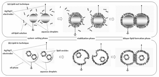 Droplet interface bilayer (DIB) is a recent technique for automated formation of multiple bilayers in parallel (Figure 5). There are two options for driving the bilayer formation [45]: the deposition of aqueous droplets into a lipid-solvent mixture (lipid-out) or the deposition of lipid vesicles on organic solvent (lipid-in). At any case, lipid monolayer droplets are spontaneously formed around the aqueous surfaces; when they collide, bilayers or higher structures are formed. Both methods include a stabilization phase, the nature of which is still uncertain; it could correspond to the time required for the formation of the monolayers [46] or some kind of gelation process takes place [47]. Lipid-in DIBs undergo a significantly less stabilization period, as droplet mobility through the solvent mixture is faster than the movement of the droplets through the lipid-solvent mixture required in lipid-out DIBs [48]. Further, the lipid-in technique can be used to produce asymmetric bilayers [49], allowing the incorporation of different vesicles in each droplet. These films are mechanically robust and very useful for studying ionic flux through membrane pores seeded within the bilayer [50] or for developing networks to simulate complex biomolecular systems [51].