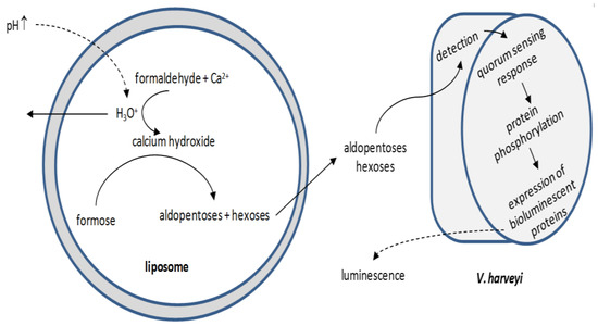 Current efforts are focused in engineering intercellular communication pathways. Gardner et al. [150] developed sugar-producing signaling liposomes: the production of sugars inside the vesicles was triggered by increasing the pH at the suspension medium; the sugars diffused into the medium, detected by V. harveyi and the detection induced a quorum-sensing response resulting in the expression of bioluminescent proteins in the bacterium (Figure 6). Lentini et al. [151] produced a hybrid (natural/synthetic) system in order to expand the sensing capabilities of a natural cell: liposomes detect environmental changes that are undetected by E. coli and release a chemical signal to E. coli to trigger a cellular response, i.e., E. coli is equipped with an artificial guard.
