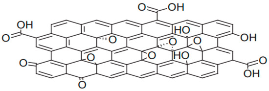 GO was first synthesized by Brodie [12] in 1859. Subsequently, Staudenmaier [13] and Hummers [14] improved the preparation method in 1898 and 1958, respectively. Afterwards, several modified Hummers’ methods as well as some other new methods were successively developed [15,16,17]. In order to identify the surface morphology and chemical structure of the resultant GO, several characterization techniques are widely employed, such as atomic force microscopy (AFM), scanning electron microscopy (SEM), transmission electron microscopy (TEM), X-ray diffraction (XRD), Raman spectroscopy, X-ray photoelectron spectroscopy (XPS), Fourier-transform infrared spectroscopy (FTIR), thermogravimetric analysis (TGA), and Zeta potential [15,16,18,19]. The resultant GO contains plentiful of oxygenated functional groups—such as hydroxyl, epoxy, and carboxyl—on its basal plane and at its edge [20], as shown in Figure 1. These functional groups endow GO good hydrophilicity and favorable water solubility, which enables a convenient and cost-effective solution process for the preparation of GO-based membrane [21,22]. Additionally, these oxygenated functional groups make GO nanosheets readily to be further surface-modified and the correspondingly functional GO-based composite membranes with preferable separation performance can be obtained.