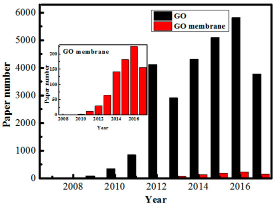 Numbers of publication for GO and GO-based membranes reported between 2008 and 2017 (topic keywords “graphene” and “graphene oxide membrane” searched from web of science), data updated by August, 2017.