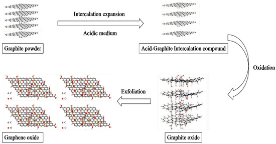 The synthetic process of GO mainly contains two steps: oxidation of graphite and exfoliation of graphite oxide, as shown in Figure 3. So far, various methods have been reported for the preparation of GO [12,13,14,15,16,17,40]. These methods, as well as their characteristics, are summarized in Table 1.