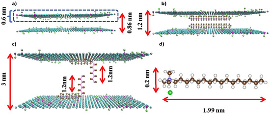 Schematic illustration of possible arrangement of C16TAB within GO membranes: (a) The pure GO membrane; (b) Two C16TAB paralleled to GO plane; (c) Two C16TAB perpendicularly arranged to GO laminate plane; (d) Molecular structure of C16TAB with C1–N chain length about 1.99 nm [96]. Copyright 2017 Elsevier.