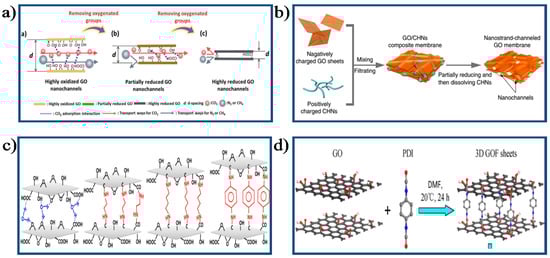 Schematic diagram of the process to tune the structure of GO membrane by chemical method: (a) Schematic illustration of the process to tune the microstructure of GO membranes via reduction method [24]. Copyright 2016 Royal Society of Chemistry; (b) The fabrication process of NSC–GO membrane [88]. Copyright 2013 Nature Publishing Group; (c) The fabrication process of GOF membranes cross-linked with diamine monomers [110]. Copyright 2014 American Chemistry Society; (d) The fabrication process of GOF membrane [27]. Copyright 2016 Elsevier.