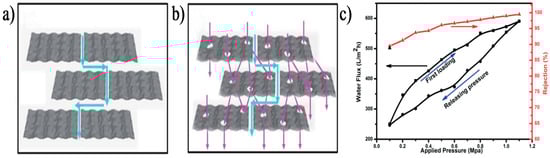 Additionally, some studies also showed that reducing GO sheets might also increase the stability of GO membrane by enhancing the π-π interactions between the GO nanosheets. Nevertheless, this would also reduce the water permeation of the membrane because of the shrunken channel distance [6,34,98,115,129]. Yang et al. [129] fabricated PDA-coated reduced GO (PDA–rGO) membranes by chemically reducing GO laminates and then introducing a hydrophilic adhesive PDA layer onto the rGO laminates and used for FO desalination. Study results showed that the resultant PDA–rGO membranes presented excellent aqueous stability and outstanding water flux (36.6 L/m2/h) with a high salt rejection rate (92.0%) in FO desalination due to the compacted nanochannels and improved surface hydrophilicity of rGO laminates. They pointed out that the chemical reduction of GO laminates could remarkably increase the salt rejection rate of the membranes by forming highly stable and compacted nanochannels between GO sheets. Moreover, the introduction of a hydrophilic PDA coating onto the rGO laminate surface could further improve the water flux by facilitating the water absorption speed into rGO nanochannels.