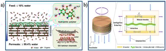 Schematic diagram of the process for improving separation performance of GO membranes: (a) Schematic illustration of the integrated GO membrane combined an ultrathin surface water-capturing polymeric layer with GO layers [116]. Copyright 2015 John Wiley and Sons; (b) Schematic illustration of the process to tune 2D channels of GO membrane with external force [55]. Copyright 2016 American Chemistry Society.