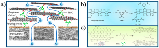 Schematic illustration of (a) The forming process of the GO membrane; (b) The interaction mechanism between PDA and TMC; (c) The interaction mechanism between GO and TMC [26]. Copyright 2013 American Chemistry Society.