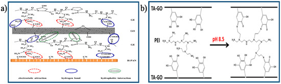 (a) Schematic illustration of the interfacial interaction in GO-based hybrid membrane [121] Copyright 2015 Elsevier; (b) Schematic illustration of the formation of covalent bonding between adjacent TA–GO sheets [124]. Copyright 2016 Elsevier.