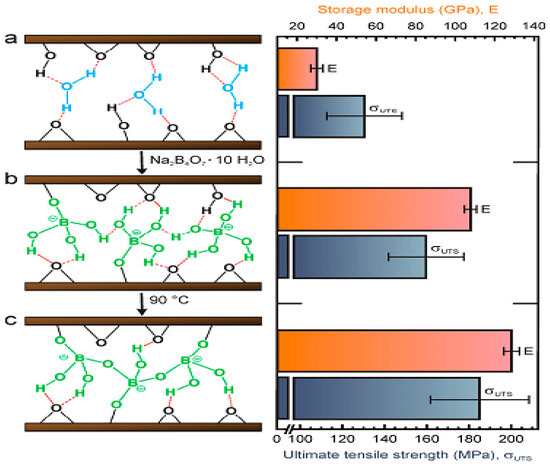 Left: Schematic diagram of the formation of covalent bonding between GO sheets and borate ion. (a) Water molecules bound the GO sheets through hydrogen bond; (b) Borate anions bound to the GO sheets through covalent bond; (c) More covalent bonds formed within the GO sheets after thermal annealing. Right: Mechanical strength of respective films [49]. Copyright 2011 John Wiely and Sons.