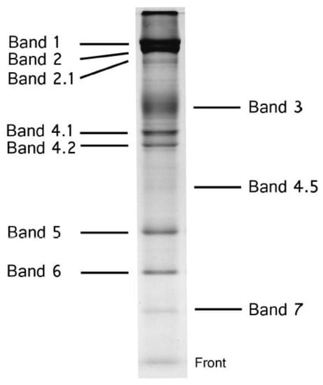 - Fairbanks, G.; Steck, T.L.; Wallach, D.F.H. Electrophoretic analysis of the major polypeptides of the human erythrocyte membrane. Biochemistry 1971, 10, 2606–2617. [Google Scholar] [CrossRef] [PubMed]