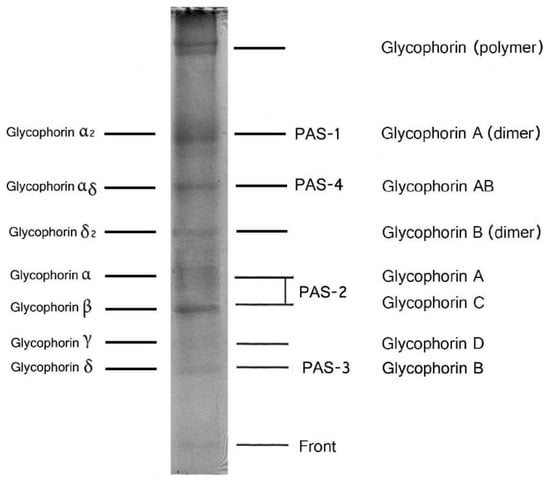 Band 3 is a glycoprotein and is detected as a diffuse band on SDS gel due to the microheterogeneity of the attached oligosaccharides [3]. Band 3 is detectable on the SDS gel by using protein staining with Coomassie Brilliant Blue (CBB) because band 3 has a small amount of oligosaccharides. Band 3 contains approximately 7% carbohydrate and contributes to approximately 10% of the total membrane carbohydrate [4]. By contrast, the sialooligosaccharide-rich glycoproteins are detectable by staining with the periodic acid-Schiff’s (PAS) reagent [1,5]. The glycoproteins detected by PAS staining are called glycophorins. Figure 2 shows the nomenclature of human red cell membrane sialoglycoproteins. The designation of glycophorins is confusing because different nomenclatures have been used by different researchers. In the first part of the 1970s, the glycophorins were called as PAS 1–4 and, at present, they are termed glycophorins A–D, respectively [6]. Glycophorin α is the same as glycophorin A, and glycophorin δ, β, and γ are glycophorins B, C, and D, respectively [6,7,8].