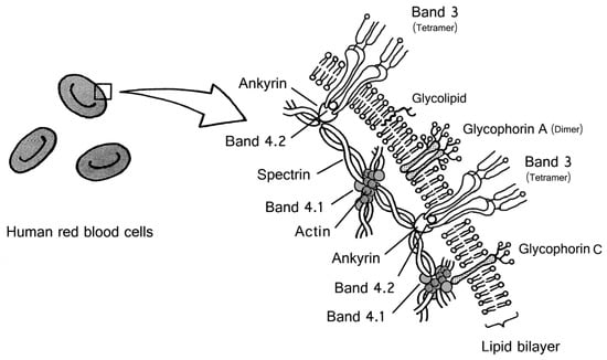 Red blood cell membrane proteins [12,13,14] can be classified into transmembrane proteins and peripheral membrane proteins that associate with the cytoplasmic side of the lipid bilayer. Band 3 and glycophorins are transmembrane proteins. Transmembrane proteins associate with the peripheral proteins that constitute the protein meshwork (cytoskeleton). Figure 3 shows a schematic drawing of the site of band 3 and glycophorins in human red blood cell membrane structure, with reference to the review on the red cell membrane skeleton [14,15]. The main component of the cytoskeleton is a spectrin tetramer. Its ends are linked by binding to the actin filament and band 4.1, and it forms a junctional complex. These junctions are linked to the end of some spectrin tetramers and form a netlike meshwork.