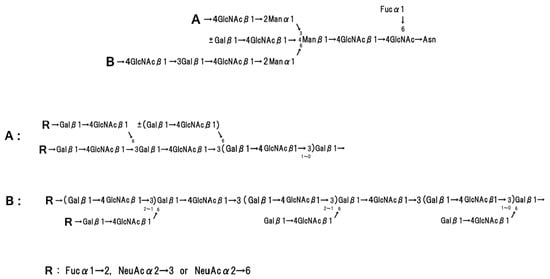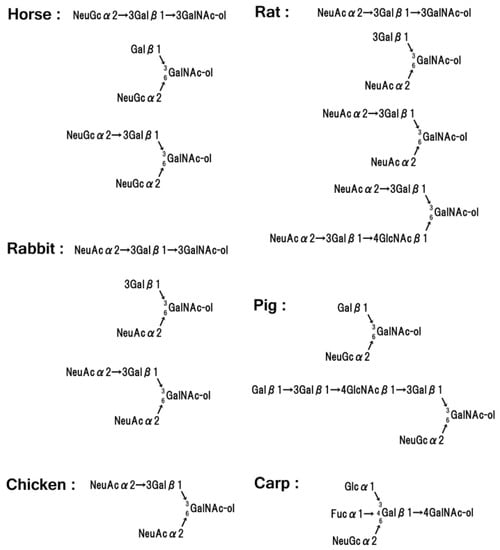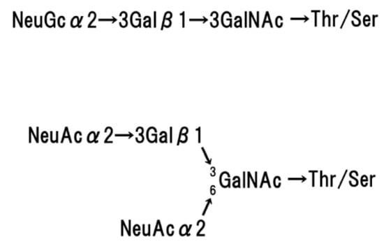 On the other hand, glycophorin patterns (PAS-stained band patterns) are different in humans [136], and these differences are caused by the component containing oligosaccharides. The glycophorins from horse [139], bovine [140], pig [141], and goat contain sialic acid as NeuGc (N-glycolylneuraminic acid), not as NeuAc [142]. While the sialic acid of dog [143] and mouse [144] is NeuAc, canine individuals containing only NeuGc have been reported. The monkey glycophorin demonstrates MN blood group activities and contains a single O-linked oligosaccharide that is composed of NeuGc, Gal, and GalNAc [145]. The core structural unit of these O-linked sialo-oligosaccharides from various mammalian sources is sialic acidα2→3Galβ1→3(sialic acidα2→6)GalNAc-ol or sialic acid α2→[3Galβ1→4GlcNacβ1]n→3Galβ1→3GalNAc-ol [146] (Figure 7).