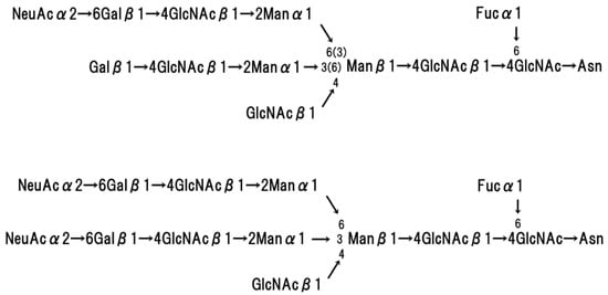 In addition to glycophorins, several glycoproteins in human red cell membranes have blood group antigens [71]. DARC/Duffy blood group antigens have been reported in proteins that contain N-glycan [72] and in the receptor for the malaria parasite [73]. Lu (Lutheran) blood antigen, which enables binding to α-spectrin, appears to contain small amounts of both N-glycan and O-glycan [74]. These glycans are affected by the expression of Lub antigenic activity [75]. Although present in only small amounts, the Kell blood group is a major antigenic system in human RBCs, and it interacts with band 3 protein [76]. This antigen is carried by a 93 kDa glycoprotein, and it has six N-linked polysaccharides that do not contain NeuAc [77,78]. However, the physiological function of Kell antigen is related to its amino acid composition, not polysaccharides [79], in contrast to I blood type antigen (the poly-N-acetyllactosamine structure) [80]. The diversity of blood group antigens, as mentioned above, which is lacking in carp sera (in the Section 9), may be related to the existence of various anti-carbohydrate antibodies in human sera [81]. Researchers are interested in the reactions of these antibodies with oligosaccharides containing mainly NeuAc, Gal, and Fuc at the termini of polysaccharides, but these antibodies do not react with Man, which is the primary component of N-glycan.