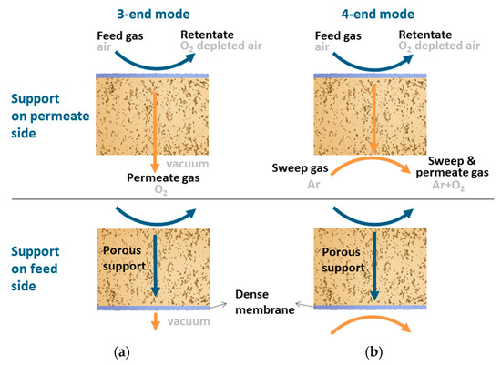 The (a) 3-end mode and (b) 4-end mode transport processes, with the support at the feed or permeate side, respectively.
