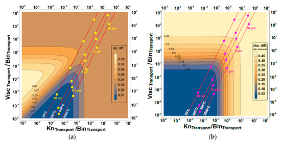The comparison between the exact solution and the surface constant pressure simplification shows a higher deviation than the averaged constant pressure simplification. The relative and absolute difference compared between the exact solution and surface constant pressure simplification (Figure 6) shows that the small pore diameters (10 nm–0.1 µm) have the least deviations, although, they are not feasible for the microstructure of the porous structure needed. From Figure 6a, 0.1 µm ≤ pore diameters ≤ 1 µm have a dependence on temperature, while the rest of the pore diameter ranges considered are not dependent on temperature.