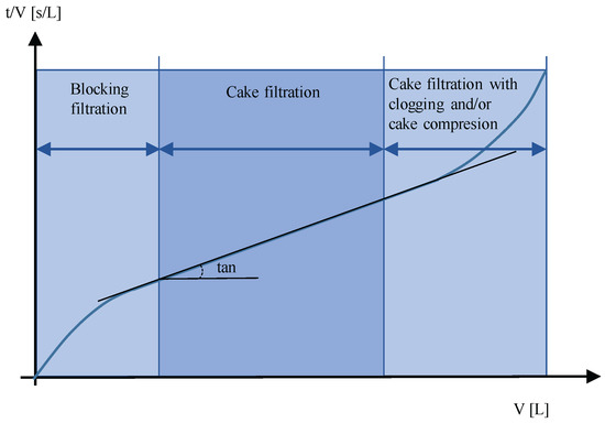 is determined in the second region of the curve vs. V (Figure 1). It can be divided into three stages: blocking filtration, cake filtration (lineal) and cake filtration with clogging and/or cake compressure. In case of a high concentration of colloids, the graph vs. V has non-linear behavior throughout the entire period, so is calculated from the first region [37].