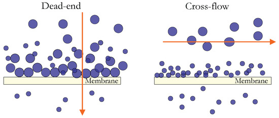 Due to the balance between the convection flow and the backscattering of particles, the larger particles with higher backscattering speeds tend to move away from the surface of the membrane, whereas the smaller particles are preferably deposited as soiling agents. These cross-flow hydrodynamic conditions lead to a different composition and structure of the cake when compared to the final blind filtration [47].