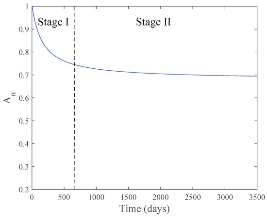 A forth model was proposed by Ruiz-García et al. [29] (Equation (16)). They include the parameter in the model and gave specific information about the behavior of the performance decline in the long term. They proposed a two-stage pattern in the decline of A in RO systems: an initial Stage I, where a more pronounced decline than Stage II was shown. This is mainly due to membrane compaction, irreversible fouling (strongly adherent films) and . Stage II is related to a gradual decrease mostly due to irreversible fouling and the frequency and efficiency of the Chemical Cleaning (CC). The model described the mentioned stages by the superposition of two exponential functions. The used about 3300 operating days of a full-scale brackish water reverse osmosis (BWRO) desalination plant to fit the parameters of the model. They got three equations, one related to maximum values of the normalized water permeability coefficient () (Post-Chemical Cleaning (Post-CC)), average and minimum values (Pre-Chemical Cleaning (Pre-CC)). This allowed obtaining equations to estimate a range of values for the coefficient in time.
