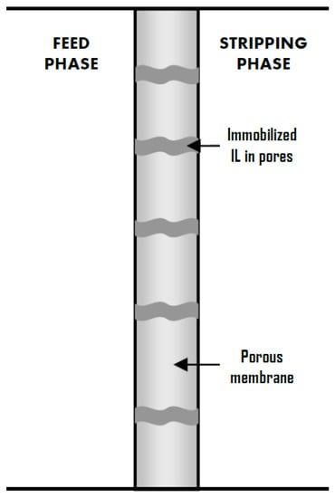 Therefore, alternative greener solvents must be preferred and ionic liquids (ILs) can be considered as a very promising option. An IL is a salt in which the ions are poorly coordinated, which results in these solvents being liquid below 100 °C, or even at room temperature. At least one ion has a delocalized charge and one component is organic, which prevents the formation of a stable crystal lattice. Each different ion pair combination results in a different set of physicochemical properties, hence they are considered as “designer solvents” []. Consequently, ILs can be formulated to be task specific and therefore, can be tailor made. Nevertheless, some characteristics that are common to most ILs must be highlighted. In particular, the negligible saturated vapour pressure of ILs is very relevant, as the loss due to evaporation is drastically avoided. Besides, their good thermal stability and non-flammability can be very useful in the applications that occur at sufficiently high temperatures []. Other interesting properties of ILs are their high ion conductivity [] and high solvent power []. In contrast to common organic solvents, these intrinsic properties of ILs make them ideal liquid phases for SLMs applications. This way, supported ionic liquid membranes (SILMs) can be obtained, which can be defined as SILMs in which the traditional solvent has been replaced by a given IL (Figure 1). SILMs can overcome the stability problems of SLMs, since not only the displacement of the liquid phase from the membrane pores through solvent evaporation is minimized but also the use of ILs allow the formation of more stable systems thanks to their higher intrinsic viscosity and surface tension []. In addition, the employment of SILMs allows the minimization of the amount of IL required for a given process, with the corresponding reduced economic costs and greatly facilitates the recovery and reusability of the IL []. Thin membranes with short diffusion paths are preferred to be employed for SILMs because they can compensate for the slow mass transfer due to the high viscosity of ILs. The proper selection of the most convenient IL for each SILM application is crucial, as high mutual solubility of water or other solvents in many ILs will restrict their use in those situations [].