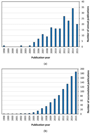 A bibliometric analysis is a very valuable tool to obtain good information and knowledge about the status of scientific research activities in specific disciplines, which help researchers to recognize novel trends and interests within investigation frameworks []. This technique utilizes statistical indices and quantitative analyses to assess the contributions of authors, institutions and countries in terms of their research output but it can be also useful in identifying relevant aspects related to qualitative features of scientific research output []. These bibliometric analyses were developed in the 1960s and can be applied to evaluate comprehensively the large number of documents that are being published []. Academic publications in scientific journals are considered the most important resources for this type of bibliometric analysis []. Bibliometric methods have been used to measure scientific progress in many disciplines of science and engineering and are a common research instrument for systematic analysis of research trends [,,,,,,,,,,,,].