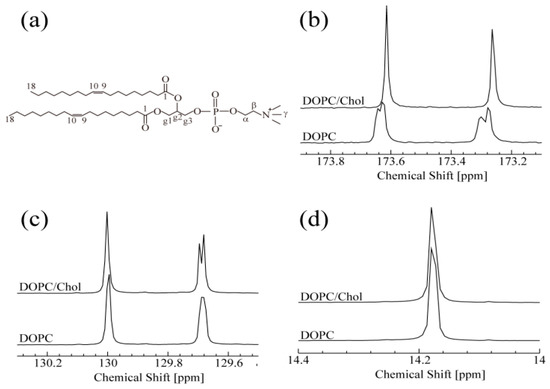 (a) Systematic numbering of the chemical structure DOPC. (b–d) 13C-NMR spectra of DOPC and DOPC/Chol systems at 15 °C. (b) Both peaks correspond to C1 of DOPC. (c) Peaks around 129.7 ppm and 130.0 ppm correspond to C10 and C9 of DOPC, respectively. (d) Peaks correspond to C18 of DOPC.