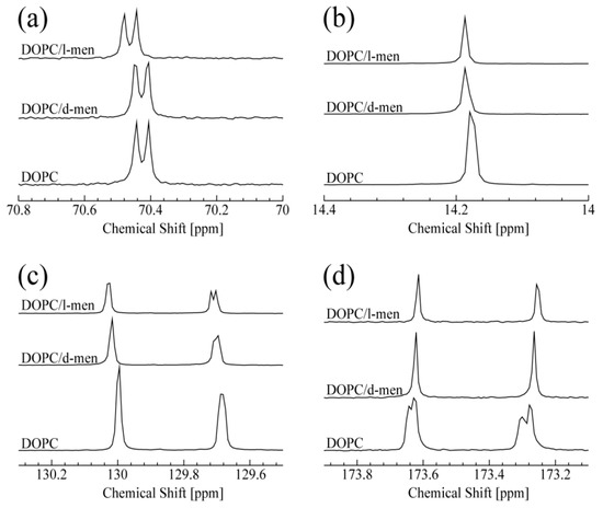 1H- and 13C-NMR measurements were conducted to investigate the interactions between lipid molecules and d- or l-menthol. As shown in Figure S1 (supplementary information), DOPC, Chol, and menthol molecules each have hydrophobic regions in their chemical structures which may play key roles for these interactions. Further information regarding the interaction between DOPC and d- or l-menthol was obtained mainly using 13C-NMR because its wide peak distribution aids analysis.