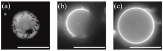 Typical fluorescence microscopic images of So domain in DOPC/DPPC (50/50) (a), Lo domain in DOPC/DPPC/Chol (40/40/20) (b), and no domain (homogeneous phase) in DOPC/DPPC/Chol (35/35/30) (c). Scale bar = 10 μm.