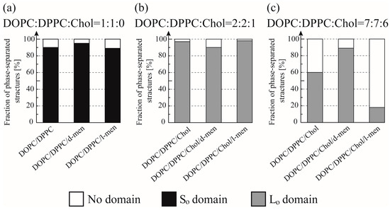 Fraction of phase-separated structures in DOPC/DPPC/Chol/menthol systems at room temperature. We fixed DOPC:DPPC:Chol = 1:1:0 in (a), DOPC:DPPC:Chol = 2:2:1 in (b), and DOPC:DPPC:Chol = 7:7:6 in (c). The mole fraction of menthol is 10%. White, black, and grey bars indicate no domain (homogeneous phase), So domain formation, and Lo domain formation, respectively. Number of liposomes counted = 55.