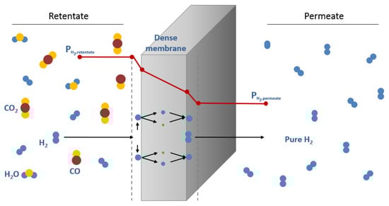 Among readily available alternatives for hydrogen purification, the use of membranes for hydrogen separation/production applications has been proposed and used in practice. This technology shows relevant advantages such as low energy consumption, environmentally good properties and also additional potential to be combined with a reaction unit in a multifunctional membrane reactor [,]. The combination of simultaneous chemical reaction and hydrogen separation in one unique step results in additional benefits in terms of conversion increase by shifting the reaction equilibrium as one of the products, hydrogen, is selectively separated from the reaction media [,]. Particularly, dense metallic based membranes have been proposed for years due to their potential to transport hydrogen in a dissociative form with a theoretically complete perm-selectivity [,]. Thus, the structure of metals belonged groups III-V, such as Pd, Ni and Pt (in pure form and alloyed), has the ability to allow the hydrogen diffusion through the metal lattice, while avoiding the permeation of other molecules [,]. In this way, the solution-diffusion mechanism, depicted in Figure 1, is used to describe the hydrogen permeation process in these H2-selective membranes.