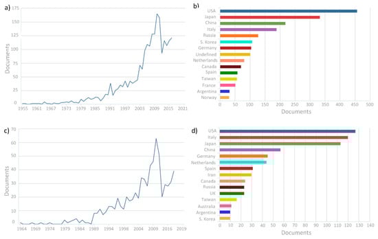 Citation analysis report by Scopus for keywords: palladium + membrane + hydrogen (a,b) and palladium + membrane reactor + hydrogen (c,d).