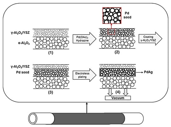 Procedure to prepare pore-filled type membranes [] with permission from © Elsevier.: (1) Incorporation of a first γ-Al2O3/YSZ layer; (2) Pd seed on smaller ceramic particles; (3) incorporation of a top additional γ-Al2O3/YSZ layer and (4) incorporation of a Pd-based layer by vacuum-assisted ELP.