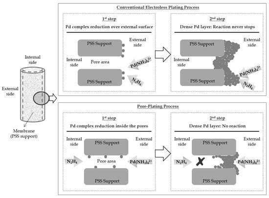 Pd incorporation around pores in both conventional electroless plating (ELP) and pore-plating (ELP-PP) alternatives [], with permission from © Elsevier.