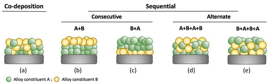 Different possibilities to prepare binary alloys by electroless plating: (a) co-deposition; (b,c) sequential deposition; (d,e) alternative deposition.