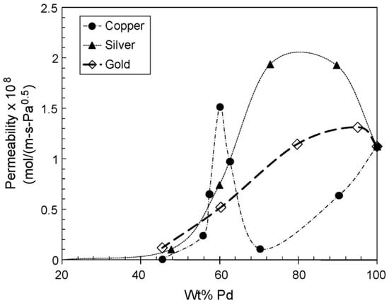 H2 permeability at 350 °C for different Pd-based alloys containing Ag, Cu and Au [], with permission from © Elsevier.