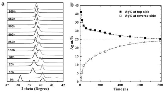Others works based on electroless-plated PdAg membranes to be highlighted are those of Andreas Goldbach and co-workers. Recently, Zeng et al. [] reported the use of sequential electroless plating to prepare H2 selective PdAg membranes on Al2O3 tubular porous asymmetric supports. They incorporated the palladium prior to the required amount of silver to achieve a final composition of Pd77Ag23, after a thermal treatment at 500 °C in the presence of H2 between each deposition. Additionally, intermediate surface activations with Pd seeds were also carried out. In this way, membranes with a final thickness in the range 2.3–2.5 μm were achieved. Despite the limited thickness of these membranes, authors indicated the need to extend the annealing treatment up to 800 h maintaining a temperature of 500 °C under atmospheric H2 pressure. The progress of annealing between palladium and silver was monitored by XRD during the entire process as it is shown in Figure 11, to assess the formation of a homogeneous PdAg alloy. These membranes exhibited a H2/N2 selectivity between 3770 and 5600, with permeance values ranged from 5.77 to 3.86 × 10−8 mol·m−1·s−1·Pa−0.5, respectively. Similar to other researchers, they also reported the frequent membrane failure during the fabrication process due to the fragility of ceramic supports [,].