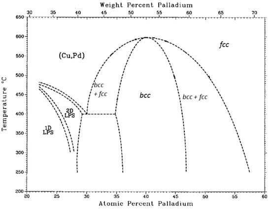 Anyway, a further thermal treatment is always required to achieve the diffusion of atoms within the solid material to form the alloy, independently of using sequential or co-deposited alternatives for the incorporation of metals. This process, also known as annealing, can be carried out under inert atmosphere (usually by using Ar, He or N2 as inert gas) [,,] or in presence of hydrogen [,,,,]. Traditional annealing processes for Pd-based membranes use inert environment at ambient pressure and require quite long times []. However, recent developments prefer faster processes in pressurized hydrogen atmosphere. In this case, it is proposed that dissolved hydrogen forms vacancies in the crystal lattice of palladium favouring the mobility of other alloy constituents and, consequently, reducing the time required to obtain the alloy []. As previously mentioned, layers prepared by co-deposition need softer thermal treatments (shorter times or lower temperatures) for annealing as compared with layers generated by sequential deposition (either consecutive or alternative) [,]. Taking into account that preparation of alloys with accurate control is a decisive challenge for the large-scale application of Pd-based membranes [], following sections summarize the most relevant advances in this field, distinguishing the preparation of binary and ternary alloys.