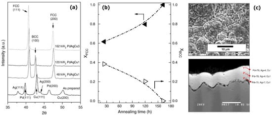 - Sumrunronnasak, S.; Tantayanon, S.; Kiatgamolchai, S. Influence of layer compositions and annealing conditions on complete formation of ternary PdAgCu alloys prepared by sequential electroless and electroplating methods. Mater. Chem. Phys. 2017, 185, 98–103. [Google Scholar] [CrossRef]