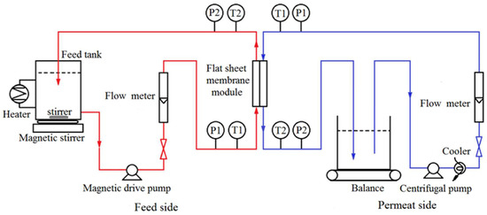 The DCMD experiments were conducted with the laboratory setup shown in Figure 1. In all DCMD experiments, the membrane was installed into a flat sheet membrane cell, giving an effective membrane area of 10 × 10−4 m2. The feed and permeate were flowing counter-currently, with the feed pumped through a magnetic drive pump at a flow rate range of Qf = 50–110 L/h and the permeate recirculated through another centrifugal pump at Qp = 50–110 L/h. A magnetic stirrer was used in the feed tank to improve the mixing of solutions. The feed temperature Tf is in the range of 50–80 °C and permeate temperature Tp was kept constant at 16 °C. Both synthetic solutions and real industrial samples were tested under the identified operating conditions through this study. The continuous weight gain of the distillate was measured using a digital balance (EK-2000i, A&D Co. Ltd., Tokyo, Japan) for membrane flux calculation. The total dissolved solids (TDS) of the permeate stream was monitored by the conductivity meter to calculate rejection of non-volatiles. For each membrane, DCMD experiments were repeated three times to ensure reproducibility.