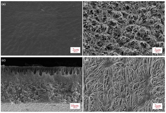SEM images of membranes (a) top surface of virgin PVDF membrane (5000×); (b) bottom surface of virgin PVDF membrane (5000×); (c) cross section of virgin PVDF membrane (1000×); (d) top surface of virgin PTFE membrane (5000×).