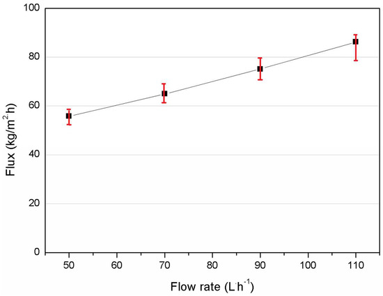 Figure 3 shows the relationship between permeation flux and the flow rates of feed and permeate, where the flow rate of both sides were kept the same. The membrane flux increases as the flow rate increases from 50 to 110 L/h (linear velocity: 0.28–0.61 m/s). This is because the increase of flow rate helps reduce the thickness of the liquid boundary layer adjacent to the membrane surface, which alleviates the effect of concentration and temperature polarization, resulting in enhanced mass and heat transfer coefficients [38]. Thus, it improves the process driving force and subsequently permeation flux. Similar investigations on flow rate have been reported [12,39]. Therefore, the highest flow rate of 110 L/h within the testing range was selected for the following tests. It is also noted that during the above DCMD experiments the salt rejection was stable at 99.99% to ensure membrane integrity.