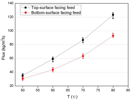 The effect of membrane orientation was investigated at varying feed temperatures from 50 to 80 °C, i.e., with the feed solution facing the top or bottom surface of the membrane. The results are presented in Figure 4. Compared to the bottom-surface-facing feed mode, the top-surface facing the feed solution produces at least 25% higher flux. For example, the flux of the top-surface facing the feed mode showed up to 123 kg·m−2·h−1 at 80 °C. This is due to the different pore structure of the two surfaces of the asymmetric PVDF membrane fabricated by the NTIPS method, producing an ultra-thin, dense and smooth top surface exhibiting no macropores that is potentially smaller than the mean free path (<0.11 μm) of the water molecules and thus will likely follow the Knudsen diffusion mechanism in the classic MD mass transfer model [40,41]; the highly porous and rough bottom surface of the membrane exhibits much larger pores and hence may fall into the regime of combined Knudsen/molecular diffusion [39,42]. Thus, MD flux involving the Knudsen mechanism is considered higher than that of the combined Knudsen/molecular diffusion mechanism, as reported in the literature [32,43]. Hence, the orientation of top surface facing the feed was used in subsequent investigations. It is noted that the salt rejection was stable at 99.99% in the above DCMD tests for both orientations.